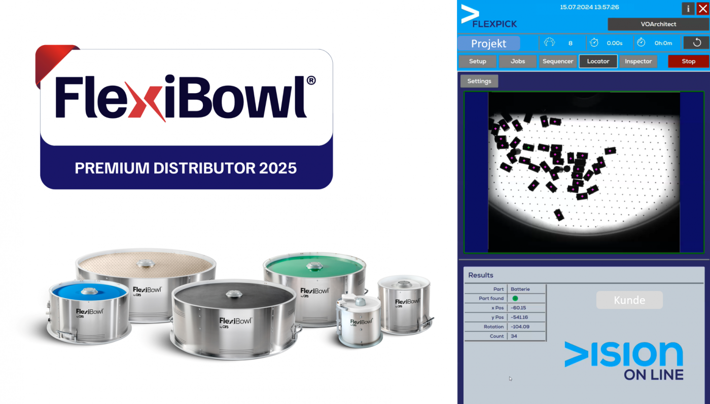 Hierbei bildet FlexPick die Kommunikationsschnittstelle zwischen Kamera, Roboter, SPS und FlexiBowl, steuert aber auch gleichermaßen, passend zum Kamerabild, den Bewegungsablauf der FlexiBowl, kontrolliert die Beleuchtungssituation, steuert Bunker an und gibt die passenden Teilekoordinaten an den Roboter weiter.
